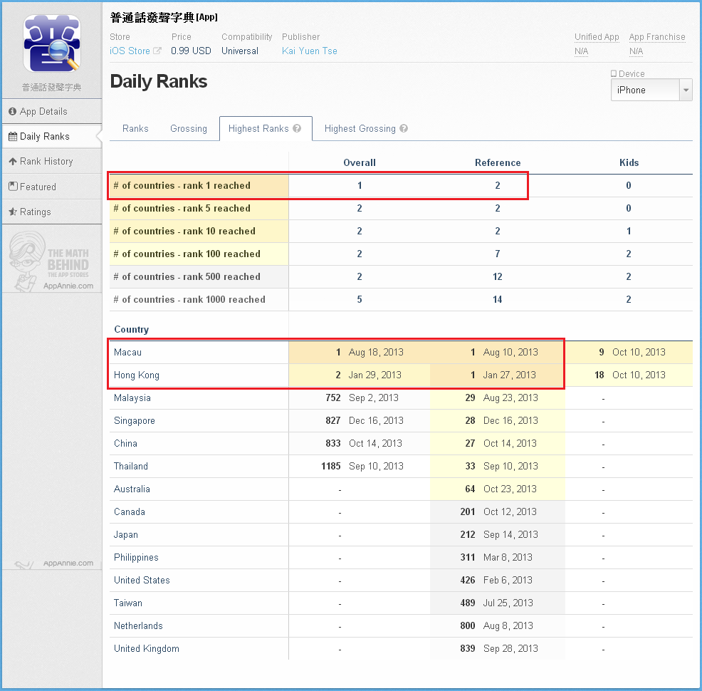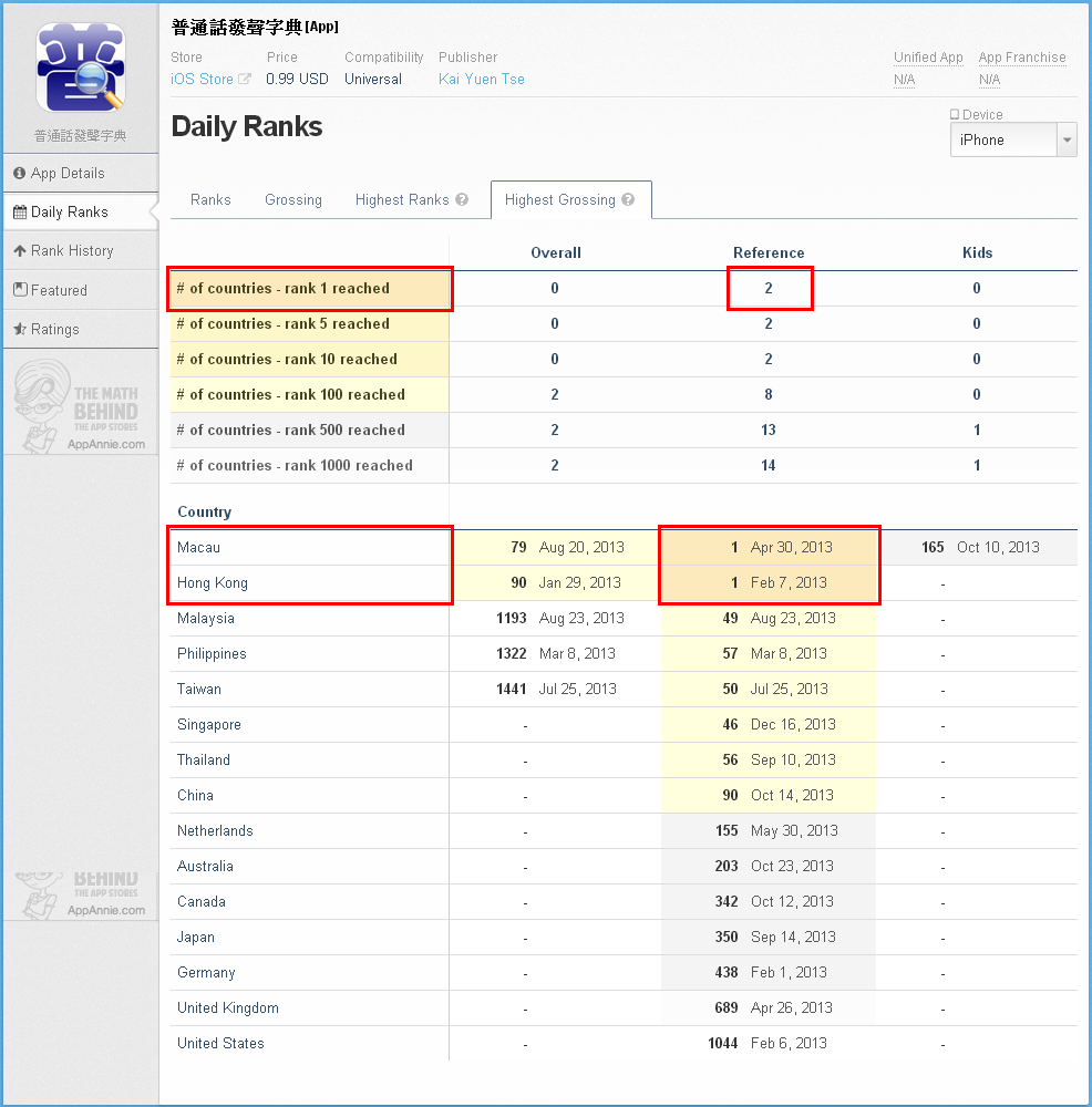 於香港及澳門app store的參考類最賣座排名,最高獲得第一位。
